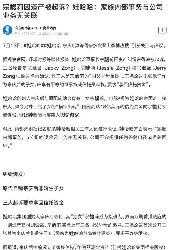 此前娃哈哈方面向媒体透露,家族内部事务,与公司运营、业务无关,公司不会提供任何答复口径或相关回应。
